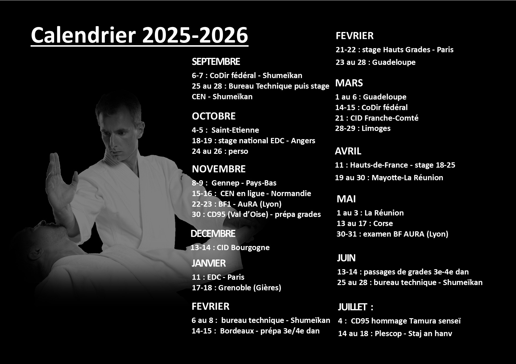 Aucun cours n'aura lieu au dojo pendant les deux semaines de vacances. Les cours reprendront le lundi 5 janvier 2026 à 19h.